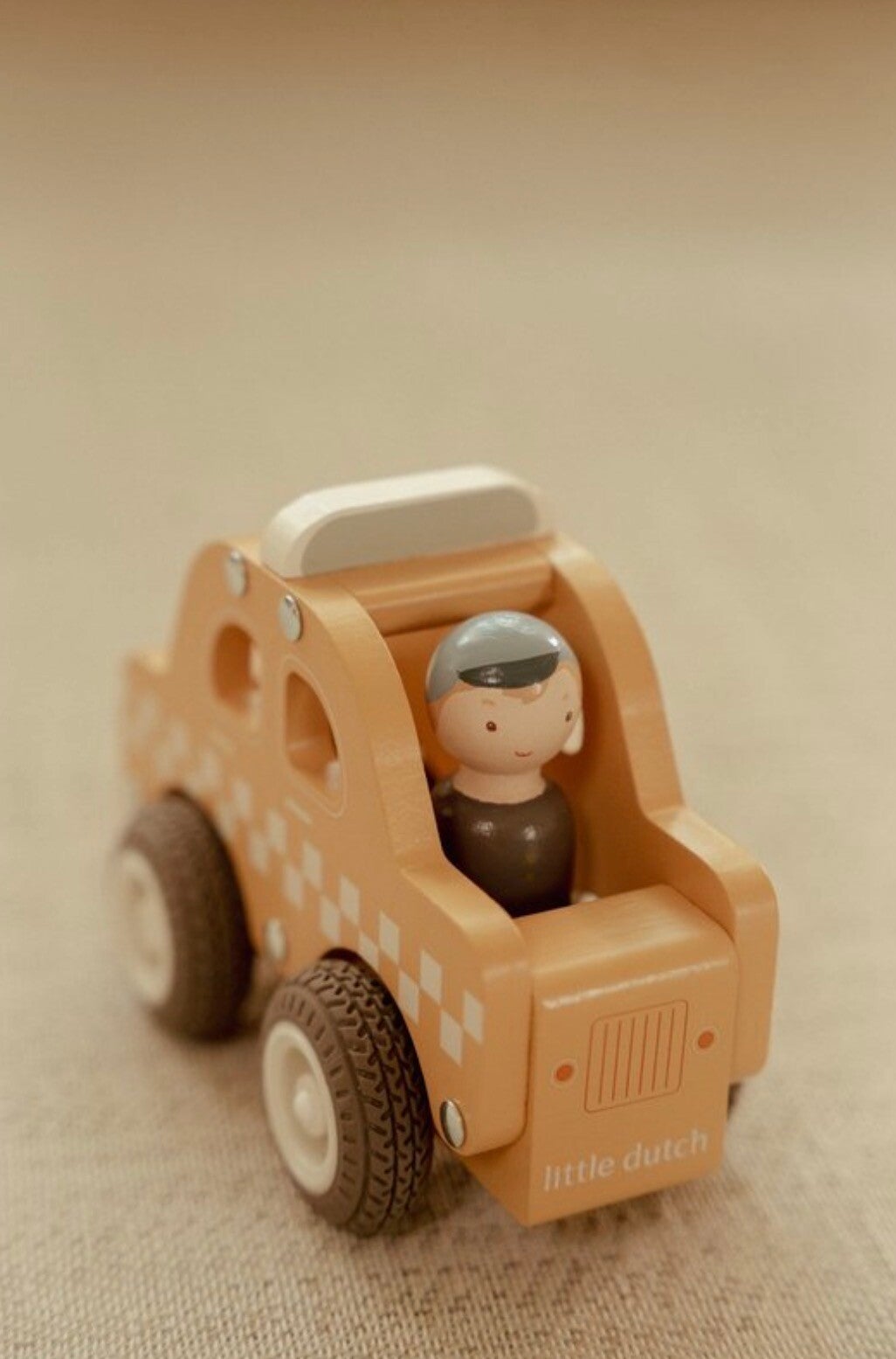 Stap in en geniet van de rit. Deze houten taxi staat klaar om passagiers veilig naar hun bestemming te brengen. De rubberen wielen zorgen voor een soepele rit en de chauffeur is